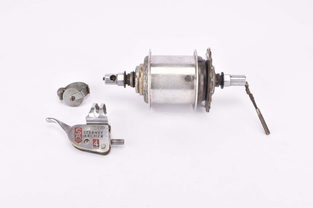 Defective Sturmey Archer F.W. Four-Speed Alloy 4-speed geared hub shifting set with freewheel and aluminum shell in 36holes, comes with shifter and cable guide from 1954 Defective Sturmey Archer F.W. Four-Speed Alloy 4-speed geared hub shifting set with freewheel and aluminum shell in 36holes, comes with shifter and cable guide from 1954