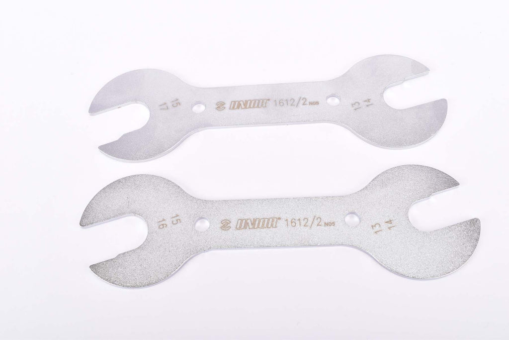 Unior Set of 13/14 x 15/16 and 13/14 x 15/17 mm double sided hub cone wrenches #1612PB (#1612/2 N05 and N06) Unior Set of 13/14 x 15/16 and 13/14 x 15/17 mm double sided hub cone wrenches #1612PB (#1612/2 N05 and N06)
