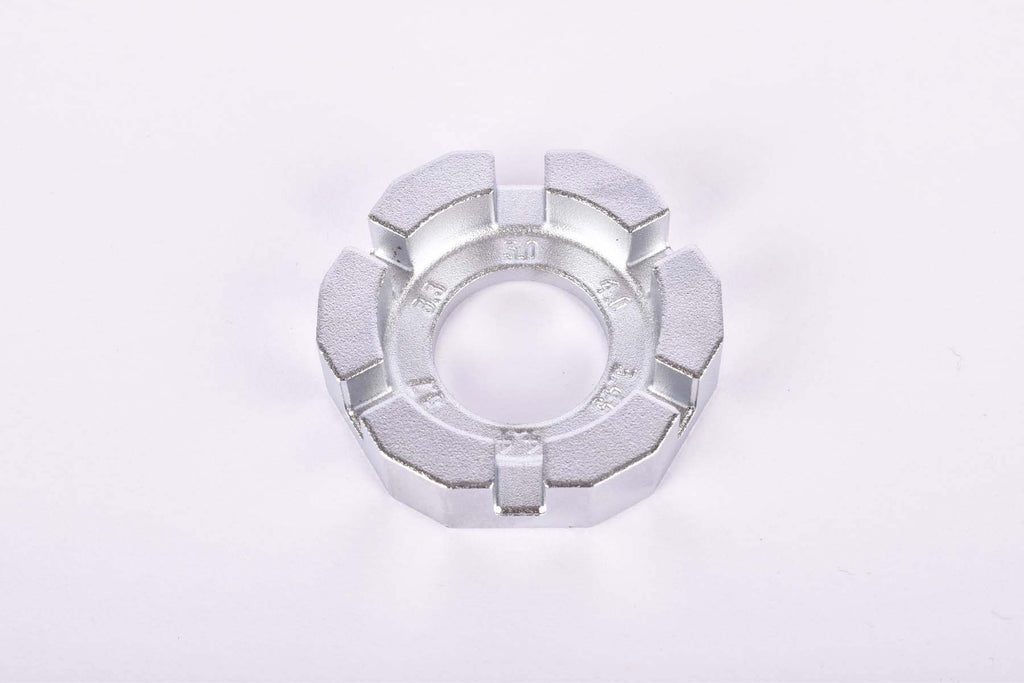 This wrench fits the popular spoke nipple flat sizes: 3.3 mm, 3.45 mm, 3.7 mm, 3.96 mm, 4.4 mm and 5mm. The shape adjusts perfectly to the hand and allows a comfortable work and easy grip. /