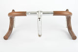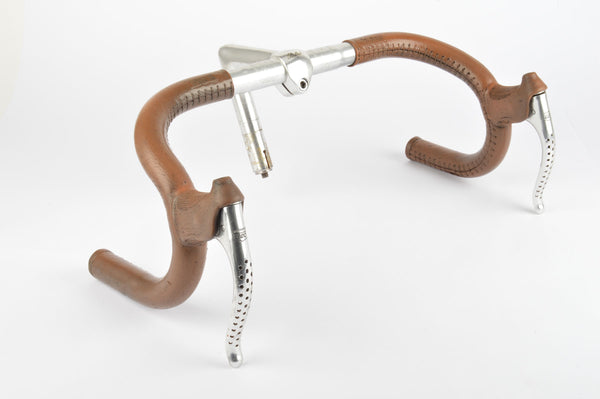 This cockpit comes from a Motobecane roadbike and contains a forged Belleri stem, aluminium Belleri dropbar, Shimano 600 brake lever and is covered in an original brown imitation leather cover from Motobecane /